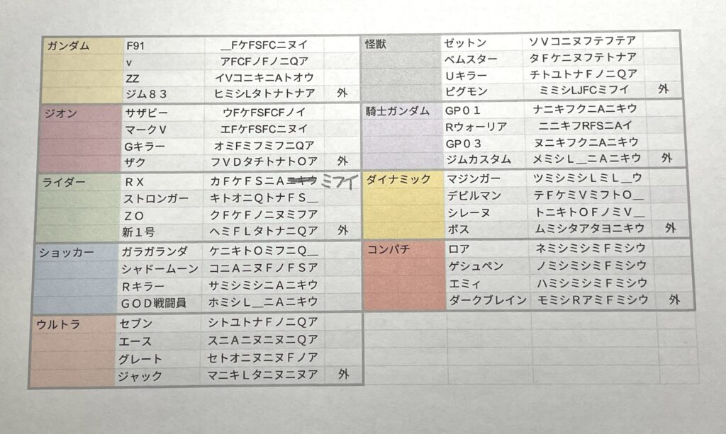 上の画像は「闘球王決定戦モード」内で全キャラクターをMAXレベルまで上げ切ったパスワード一覧です。「外」表示があるキャラは外野キャラクターとなります。